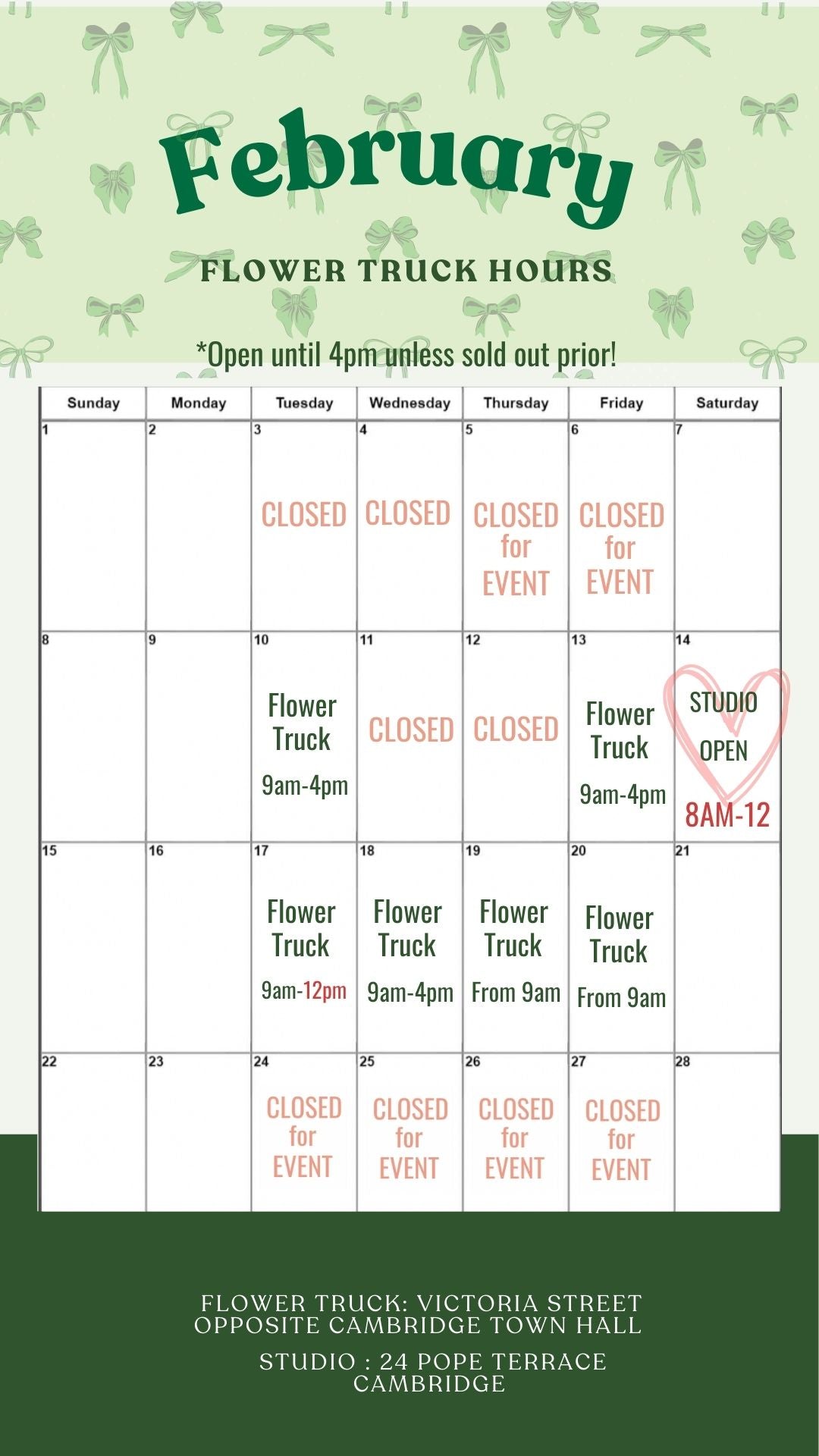 Explore the opening hours of our Floral Studio and Flower Truck for easy access to beautiful blooms.
