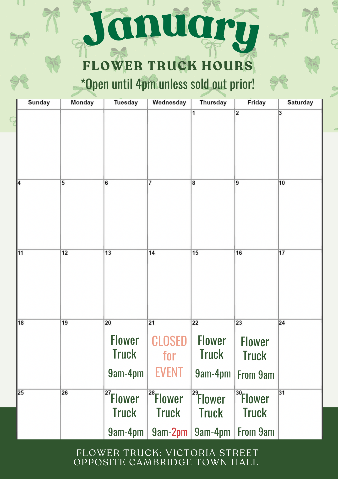 Explore the opening hours of our Floral Studio and Flower Truck for easy access to beautiful blooms.
