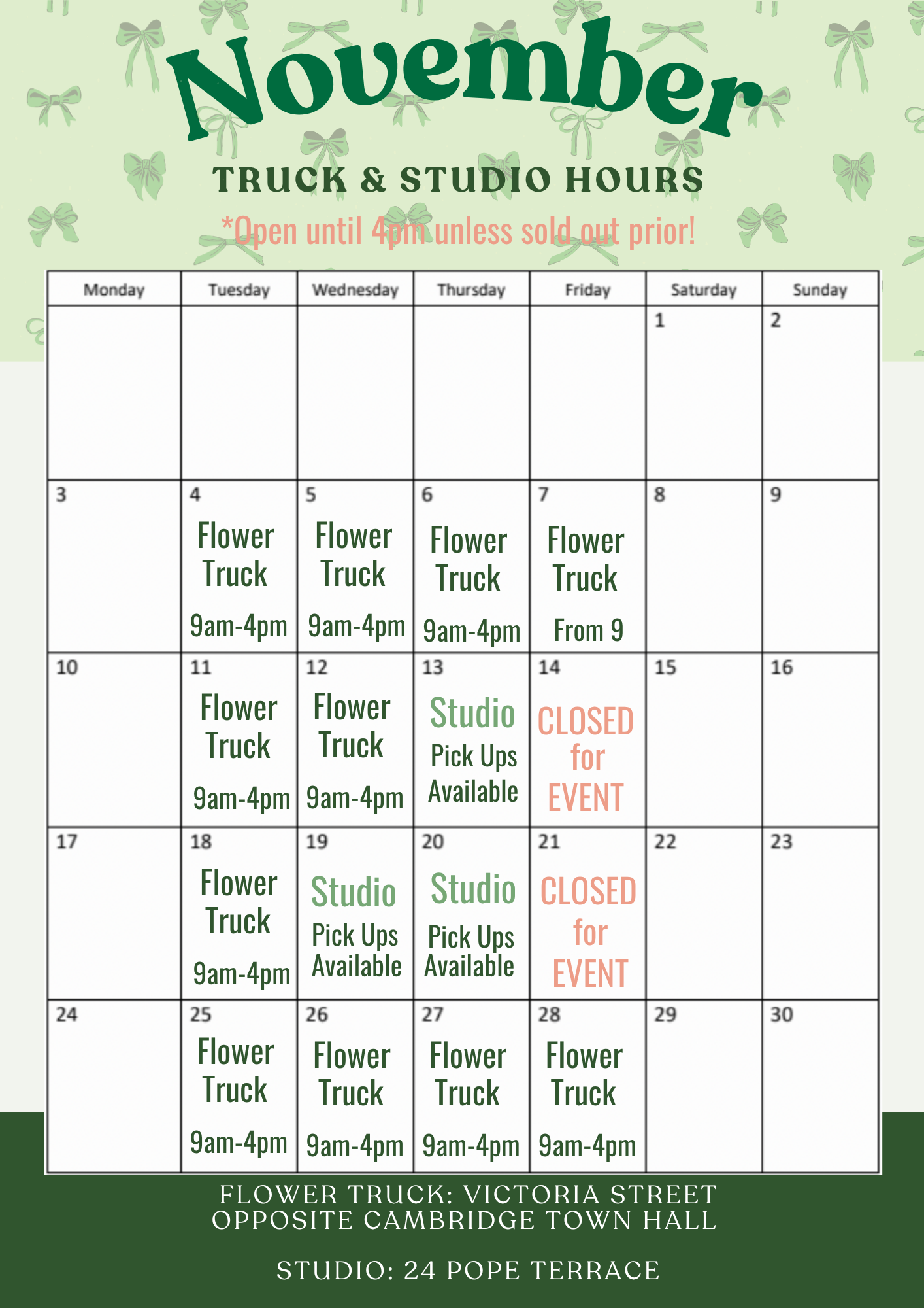 Explore the opening hours of our Floral Studio and Flower Truck for easy access to beautiful blooms.